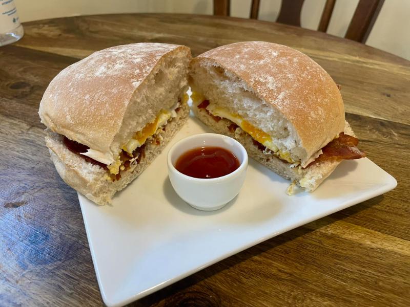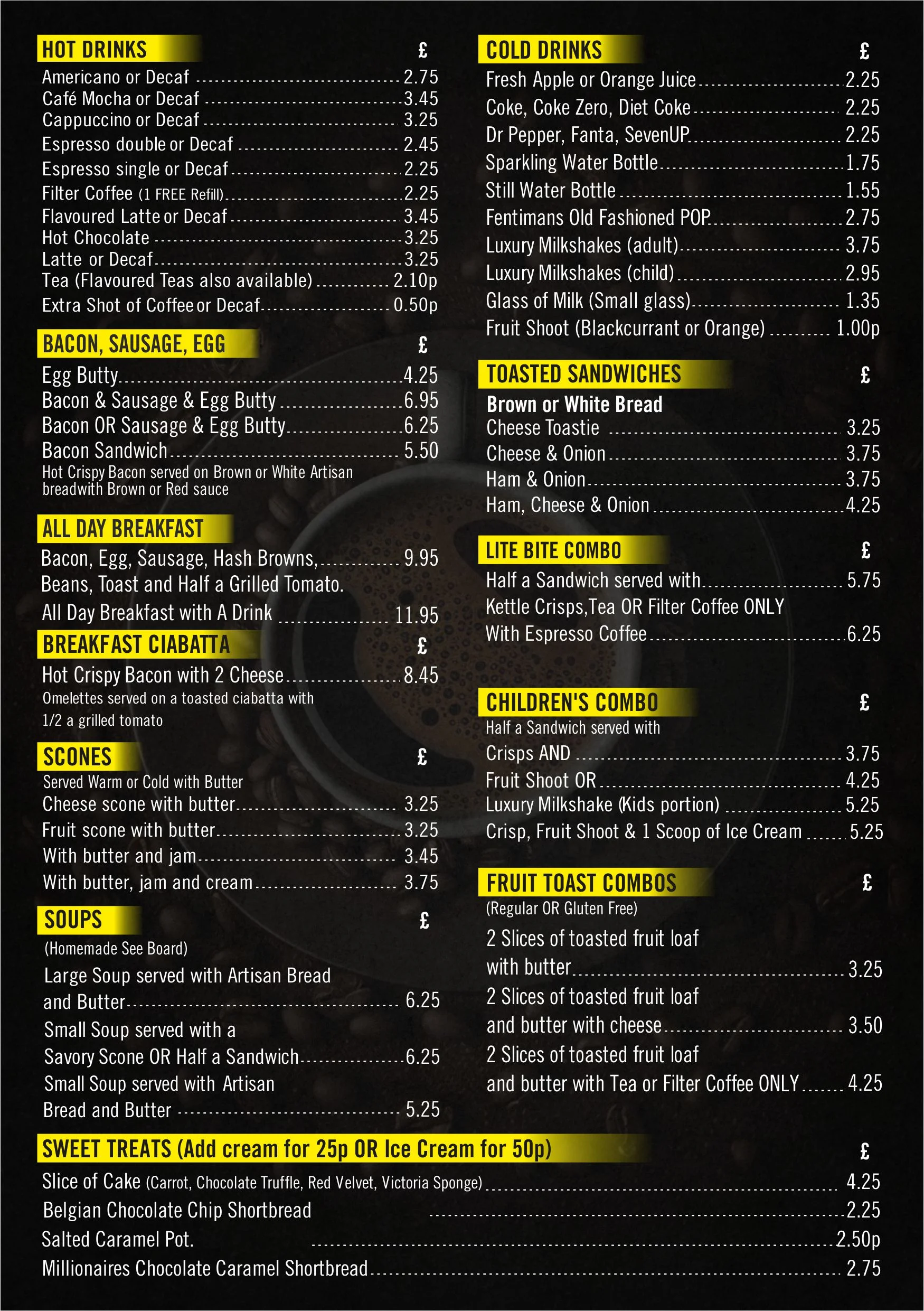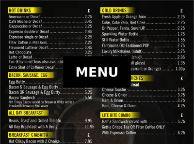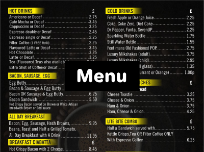 Our menu provides a wide choice including our All Day Breakfast, Breakfast Ciabatta, Bacon, Bacon & Egg or Sausage & Egg Sandwiches, Ham, Cheese & Onion Toasties, Cheese or Fruit Scones served with Butter, Jam or both.